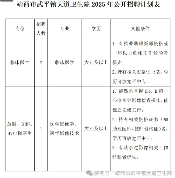 原文標(biāo)題:靖西市武平鎮(zhèn)大道衛(wèi)生院2025年公開(kāi)招聘臨床醫(yī)生、影像專(zhuān)業(yè)技術(shù)人員公告!