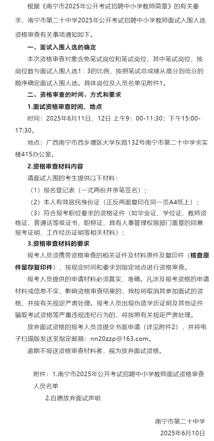 南寧市第二十中學(xué)2025年公開(kāi)考試招聘中小學(xué)教師面試入圍人選資格審查通知