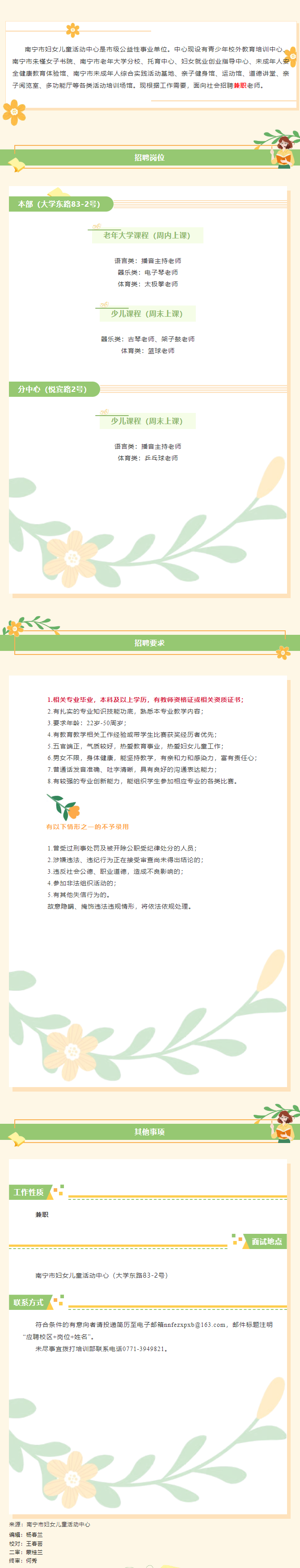 南寧市婦女兒童活動中心招聘教師若干人