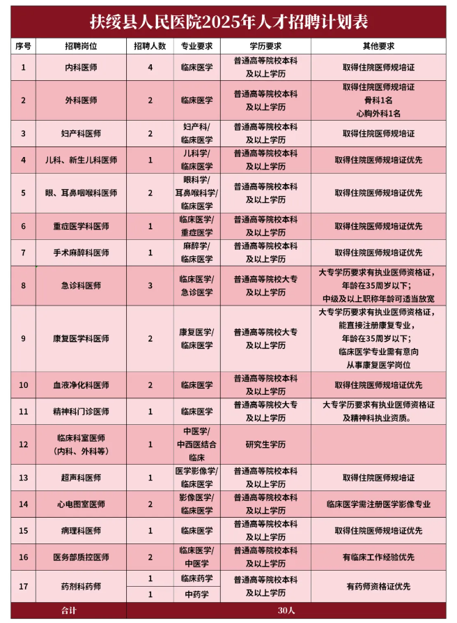為進一步充實現有人才隊伍,促進醫(yī)院學科發(fā)展,提升醫(yī)院綜合實力,結合醫(yī)院實際工作需要,扶綏縣人民醫(yī)院決定面向社會進行公開招聘各類醫(yī)學人才,具體招聘事宜如下: