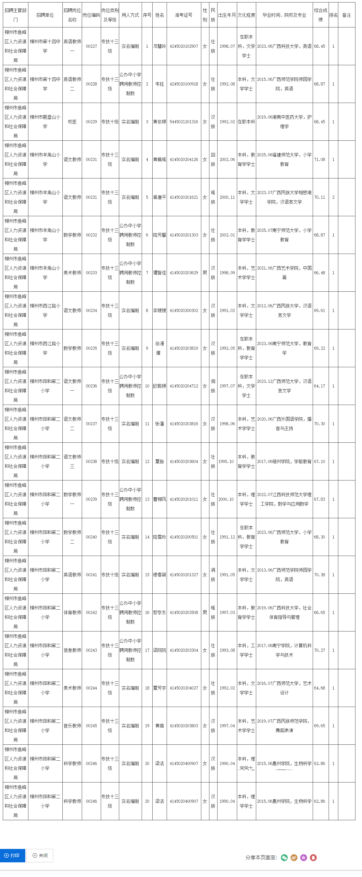 根據(jù)《柳州市2025年度上半年事業(yè)單位公開考試招聘工作人員公告》要求,鄧慧玲等20名同志經(jīng)筆試、面試、考核、體檢合格,符合聘用條件。經(jīng)研究決定,擬聘用鄧慧玲等20名同志為我單位工作人員,現(xiàn)予以公示,公示期7日(2025年7月21日至2025年7月27日)。對擬聘用的同志如有異議,請以書面形式,并署真實姓名和聯(lián)系地址,于2025年7月27日前郵寄或直接送我單位(地址:柳州市靜蘭路10號;郵編:545005,電話0772-3162402),群眾如實反映有關問題受法律保護。)