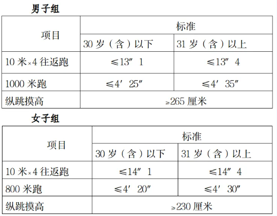 2.體測項目和標(biāo)準(zhǔn)。參照《關(guān)于印發(fā)公安機(jī)關(guān)錄用人民警察體能測評項目和標(biāo)準(zhǔn)(暫行)的通知》(人社部發(fā)〔2011〕48號)的項目及測試規(guī)則,結(jié)合《公安民警體育鍛煉達(dá)標(biāo)手冊》成績標(biāo)準(zhǔn),本次體能測評的項目和標(biāo)準(zhǔn)如下: