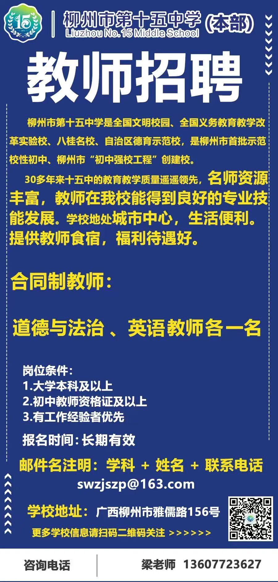 原文標(biāo)題:柳州市第十五中學(xué)本部招聘公告